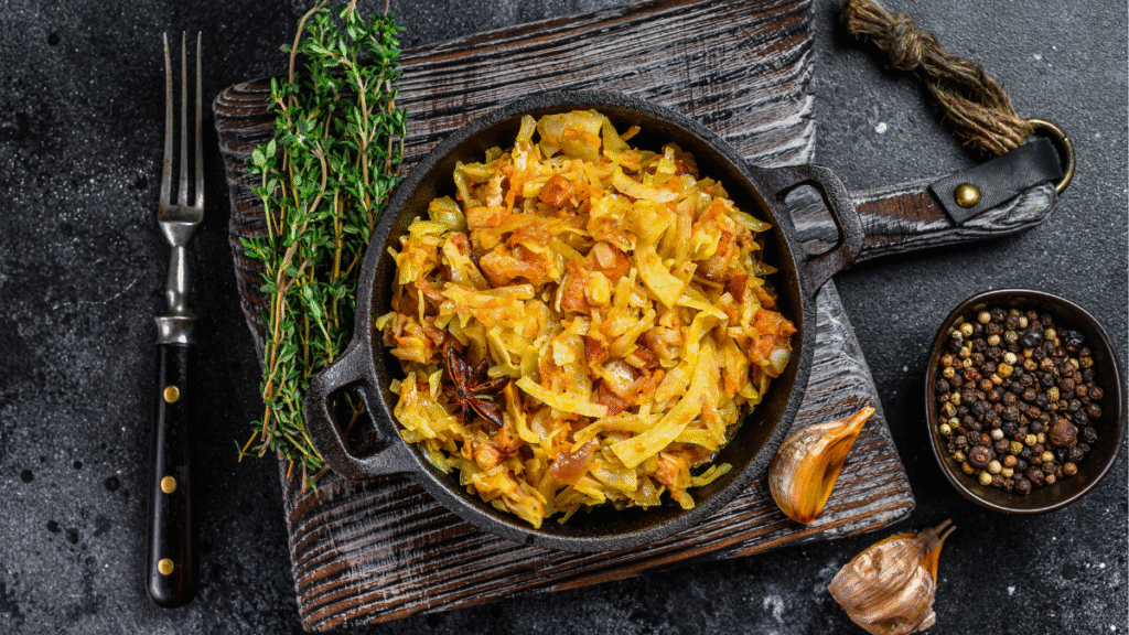 - Duś na średnim ogniu ok. 45-50 minut, aż kapusta zmięknie.